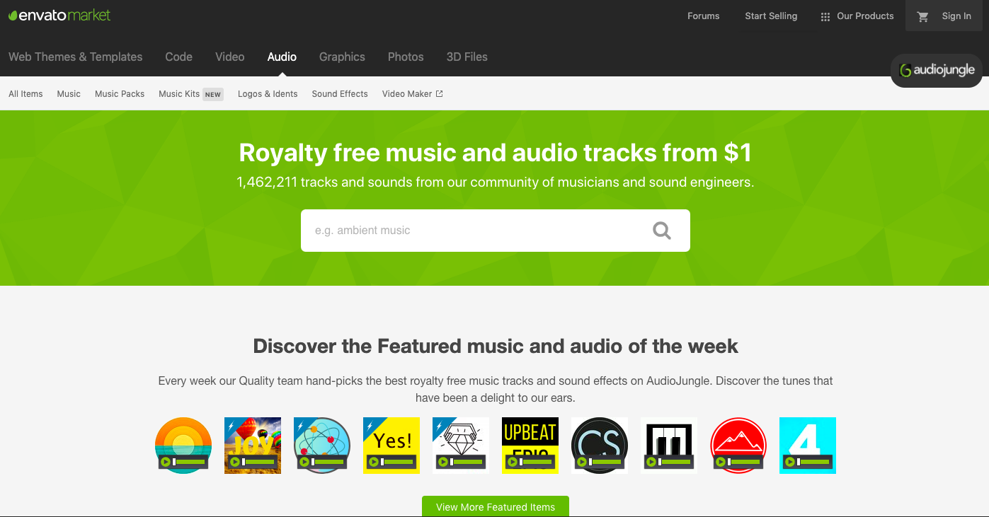 Audiojungle, also known as Envato Market has a huge collection of stock music in all genres. It has a global community of musicians and sound engineers that uploads their own tracks. You can browse these tracks through categories, recent items, or most popular.