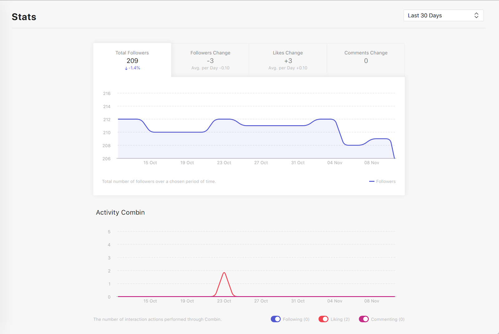 Combin Growth would not be a proper tool for Instagram promotion if it didn’t let you track the performance. Within the tool, you can control how your strategy works. Track the changes in your followers’, likes, and comments change in a set window of time.