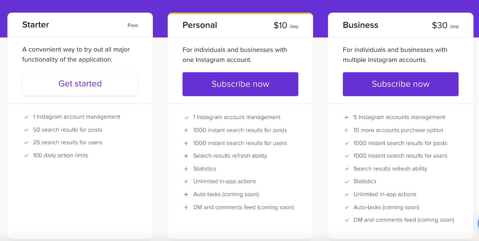 Personal and Business plans of Combin Growth vary from $10 to $30 per month and have all the advanced features and enlarged actions limits.