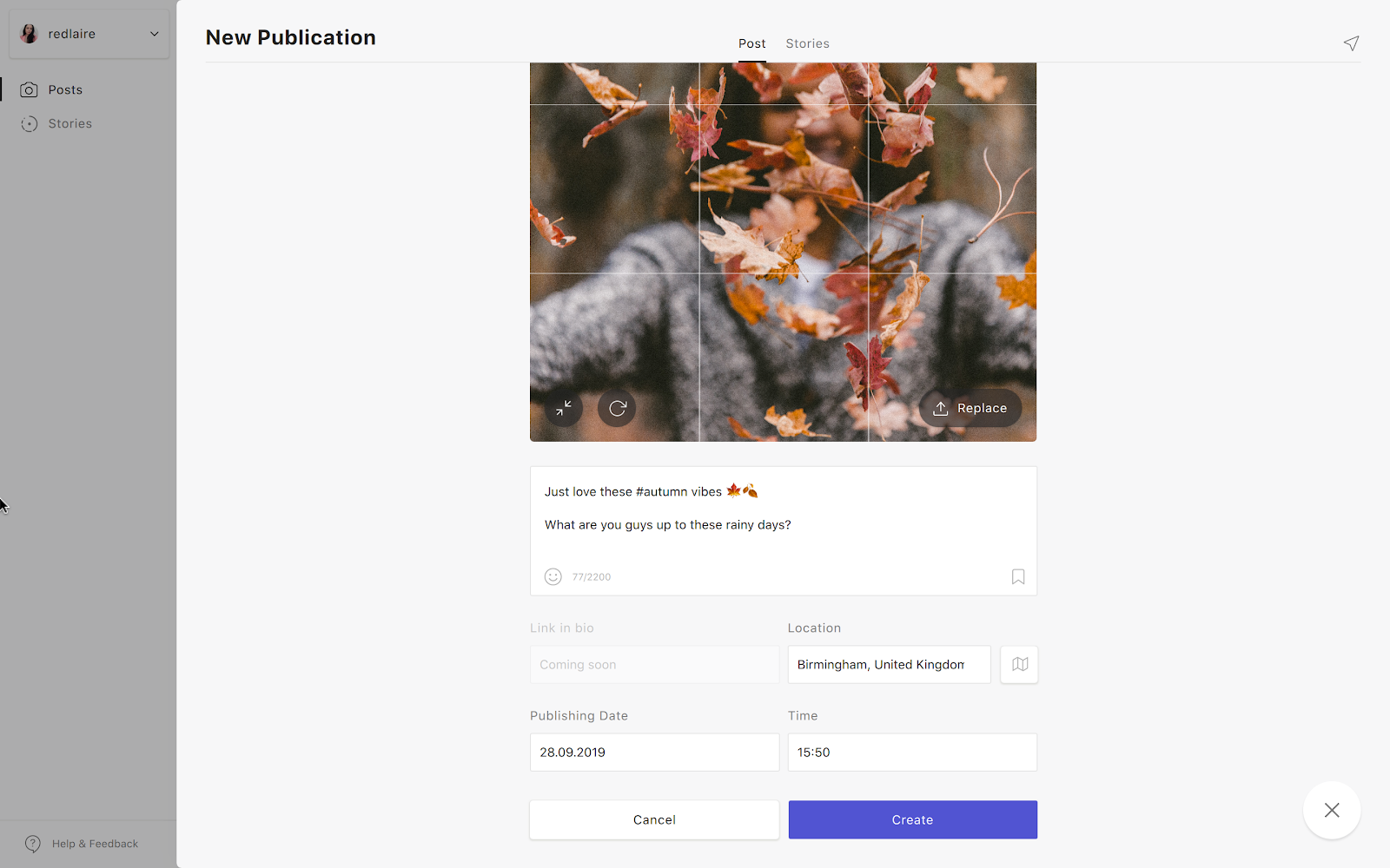 Plan your posts and stories in one click and bulk. Just pick a file (or several) on your PC or Mac, select the required time and date, choose a location, and write a caption. You can also make your caption attract more people and sound engaging by adding hashtags and mentioning other users.