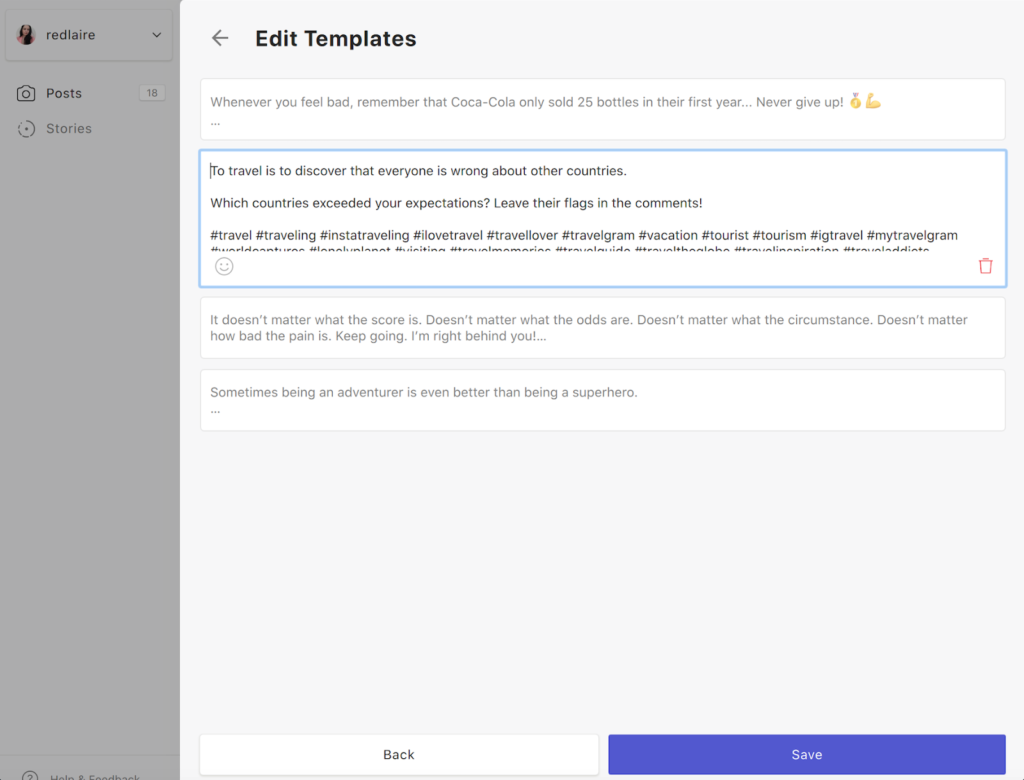 With Combin Scheduler, you can store these hashtags in Templates, edit and use them on demand.