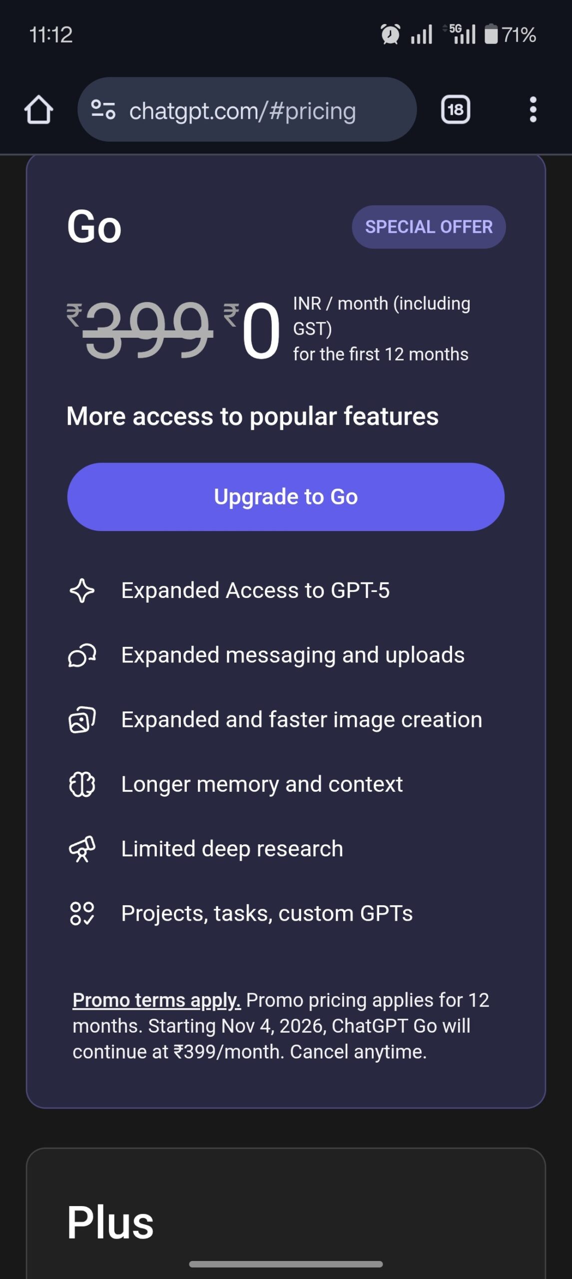 (Note: The offer isn’t available in the mobile app yet.) - On the next screen, you’ll see the ChatGPT Go plan displayed with ₹399 crossed out and ₹0 for 12 months. Click “Upgrade to Go.”