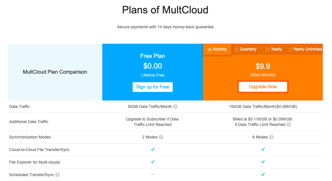 Multcloud is free for up to 50GB data traffic every month which is enough for the average user. However, there is a paid version ($9.9 monthly, $29.90 quarterly, $89.90 yearly) with advanced features, multiple accounts, scheduling, syncing, VIP servers, and more.