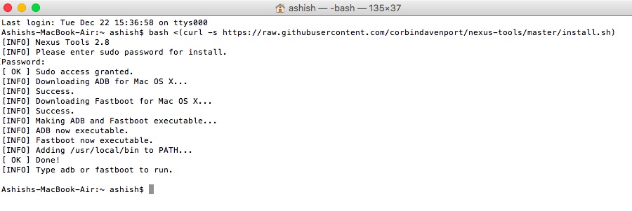 - It will ask for your password detail to proceed, enter your login password and it will install ADB and Fastboot on Mac OS.