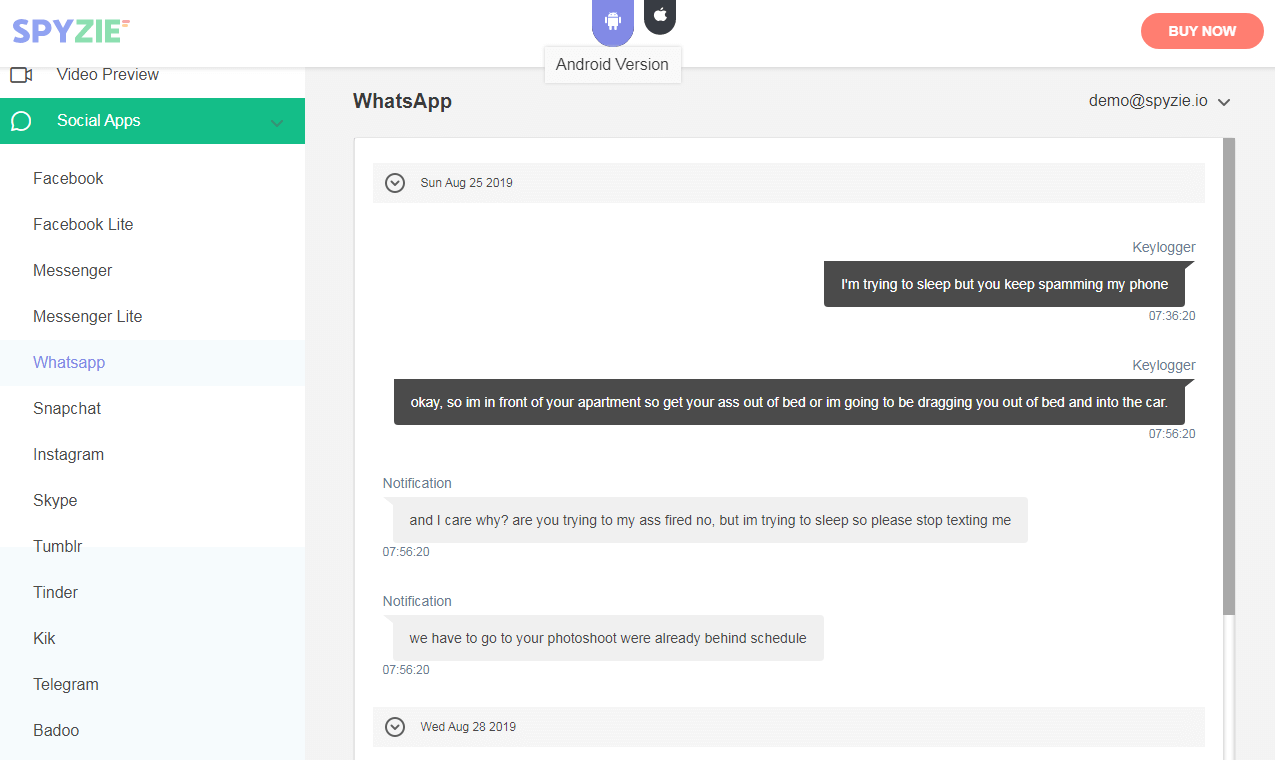 This is an impressive feature of the Spyzie app. It logs each keystroke used on the target device. It stores the data in an organized way and according to the app used.