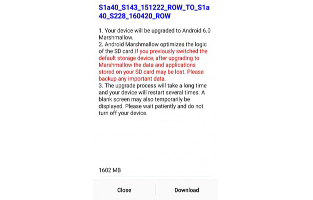 The new Marshmallow update packed with features like Now on Tap, Doze Mode, New App Permissions and more. The Android 6.0 Marshmallow update for Lenovo Vibe S1 available via OTA (over-the-air) and it is about 1.6GB in size. The OTA update comes with built no. S1a40_S143_151222_ROW To P1a40_S228_160420_ROW which Update Lenovo Vibe S1 to Marshmallow. The update may wipe SD Card data, so it is advisable to take a backup before you Update Lenovo Vibe S1 to Marshmallow.
